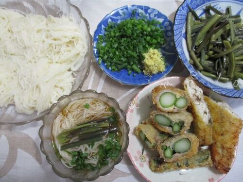 #今週のお題「そうめん」 手延べ素麺とアスパラ巻きフライ 私は手延べそうめんが好きです。 細くてコシがあり、夏は手延べそうめんが最高! 薬味は小ねぎを刻み、おろし生姜、そして季節のみょうがや青しそを添えます。 炭水化物オンリーだと糖質が高くなる…